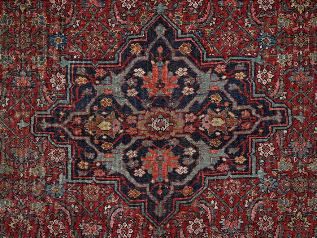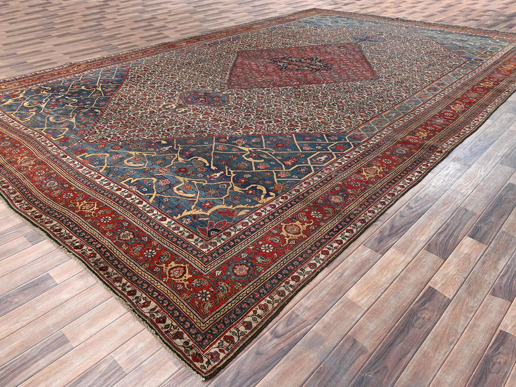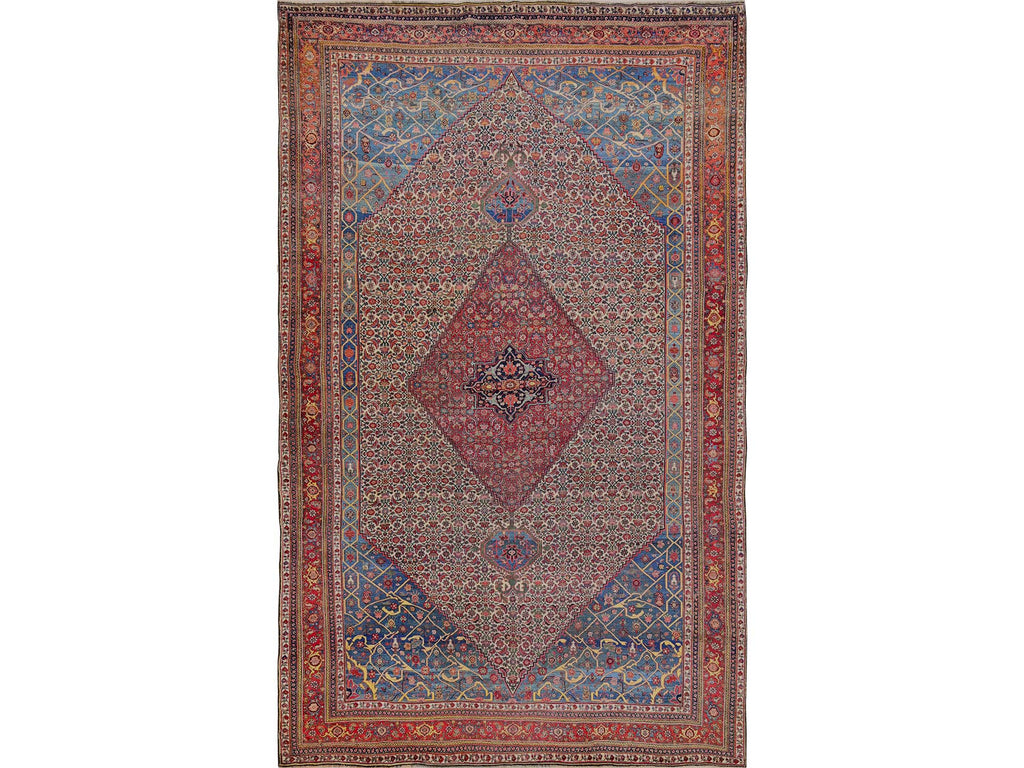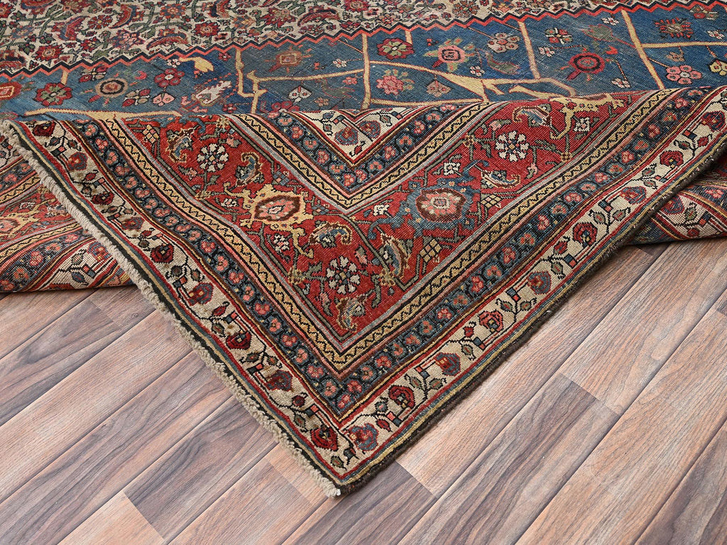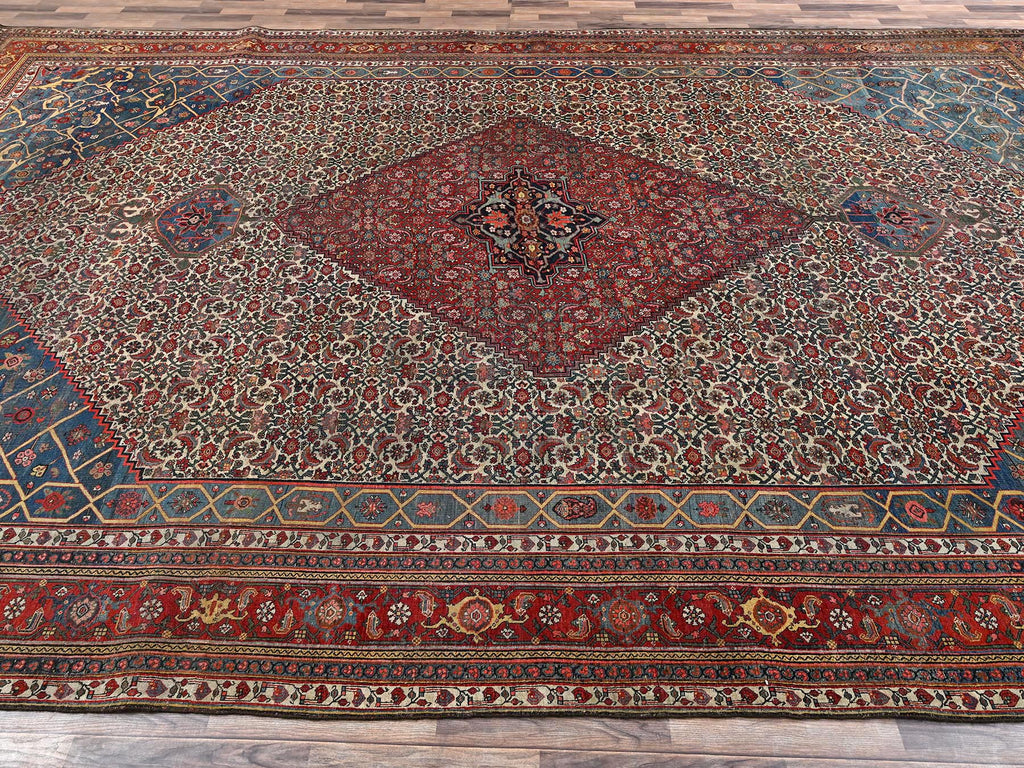 Condition: Used Weave Type: Hand Knotted Shape: Rectangle Size: 11’6″ x 18’10” Main Color: Ivory Border Color: Red Other Colors: Yellow, Brown, Blue, Pink, Green Top Material: Wool Base Material: Wool Collection: Antique Rug Number: MOA1022072
