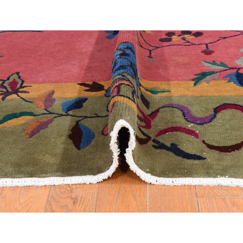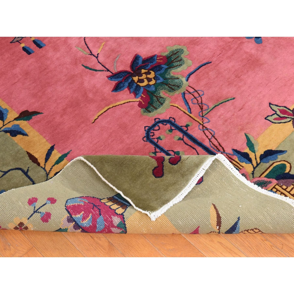 Condition: Used Weave Type: Hand Knotted Shape: Rectangle Size: 9’0″ x 11’4″ Main Color: Pink Border Color: Green Other Colors: Yellow, Blue, Purple, Red, Brown Top Material: Wool Base Material: Cotton Collection: Antique Rug Number: MOA10278429