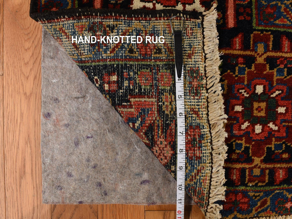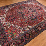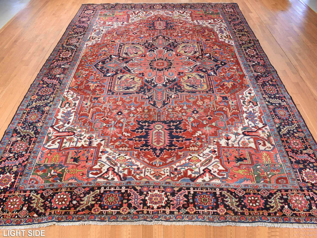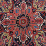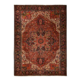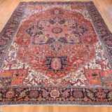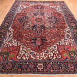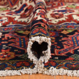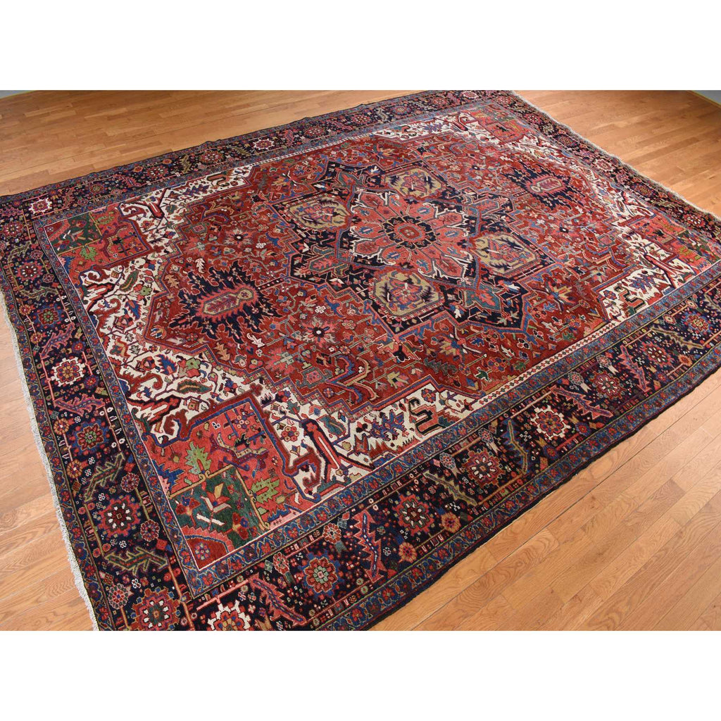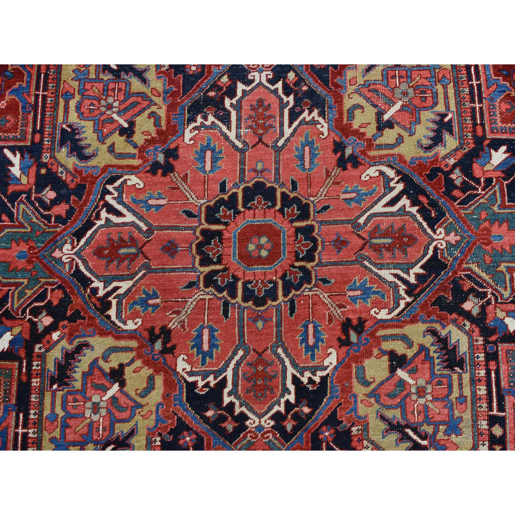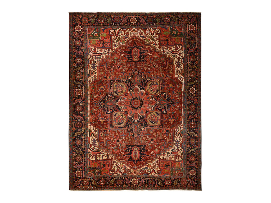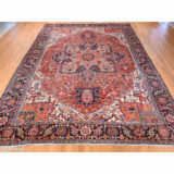 Condition: Used Weave Type: Hand Knotted Shape: Rectangle Size: 11’0″ x 14’7″ Main Color: Red Border Color: Midnight Blue Other Colors: Yellow, Orange, Green, Ivory Top Material: Wool Base Material: Cotton Collection: Antique Rug Number: MOA10278226