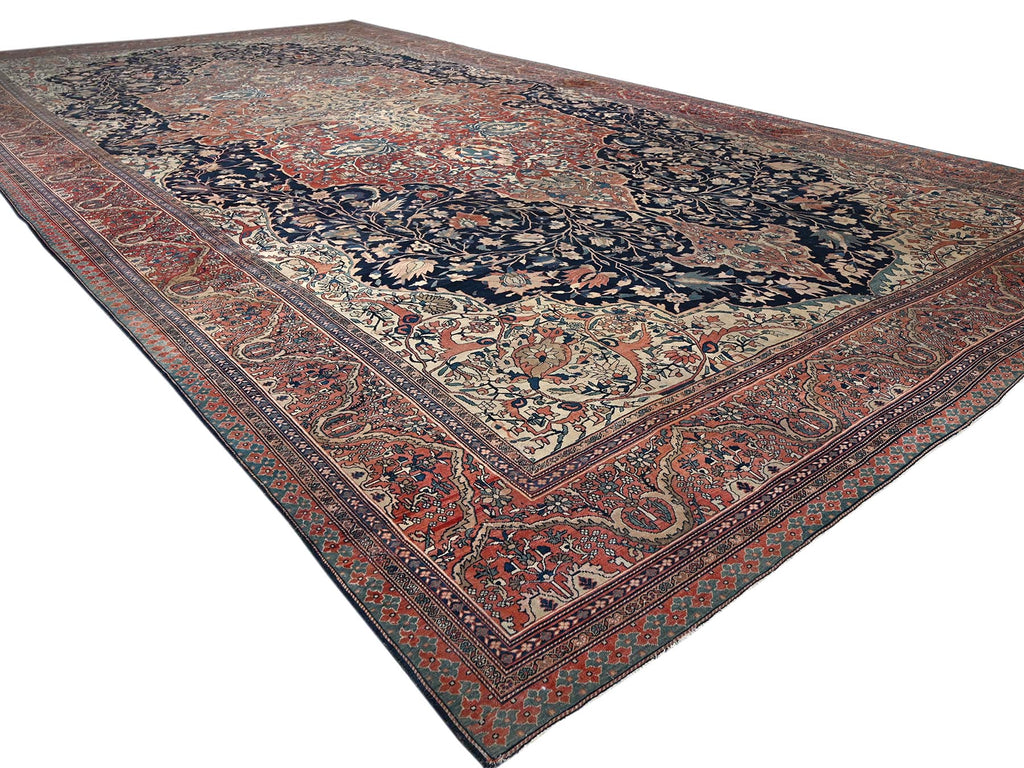 Condition: Used Weave Type: Hand Knotted Shape: Rectangle Size: 14’0″ x 25’9″ Main Color: Red Border Color: Red Other Colors: Ivory, Shades of Blue, Brown Top Material: Wool Base Material: Cotton Collection: Antique Rug Number: MOA1022079