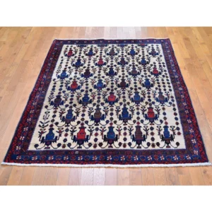 Vintage Hand Knotted Ivory Wool Rectangle Oriental Rug 3’5″ x 5’2″