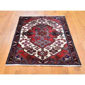 Condition: Used Weave Type: Hand Knotted Shape: Rectangle Size: 3’7″ x 5’3″ Main Color: Red Border Color: Ivory Other Colors: Navy Blue, Denim Blue, Green, Gold, Light Blue, Brown ...
