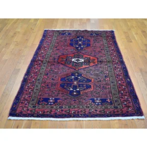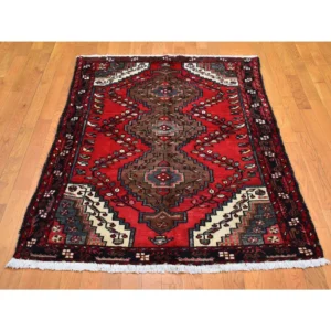 Condition: Used Weave Type: Hand Knotted Shape: Rectangle Size: 4’0″ x 7’7″ Main Color: Red Border Color: Ivory Other Colors: Navy Blue, Green, Brown, Yellow Top Material: Wool Base ...