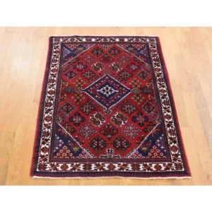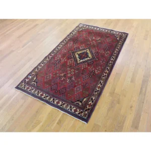 Condition: Used Weave Type: Hand Knotted Shape: Rectangle Size: 3’8″ x 5’10” Main Color: Red Border Color: Denim Blue Other Colors: Yellow, Ivory, Charcoal Black, Red Clay, Navy Blue, ...